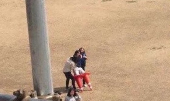 手足両方にはめると、まるでアニメのロボットのような感じでめっちゃかっこいい! だが、立つのはかなりのバランス感覚が必要なようで、友人たちに支えられていないと…あっという間に倒れてしまうようだ。ばったりと転んでしまった女の子を「アイヨー」ってな感じで見てる右の女の子が、なんかかわいいぞ!