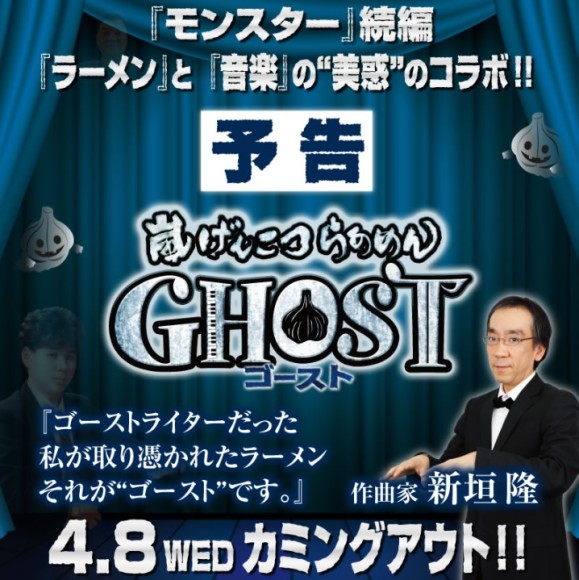 今回、新垣さんはラーメン「ゴースト」のテーマ曲も作曲することに。元ゴーストライターが作曲する「ゴースト」のテーマ曲……「ダジャレかよ!」と思わず突っ込みたくなりますが、新垣さんご自身はいたって真面目! しかし、「もしかしたらゴーストを雇ってやるかもしれません」発言も飛び出しており、今後の動向が非常に気になるところです。